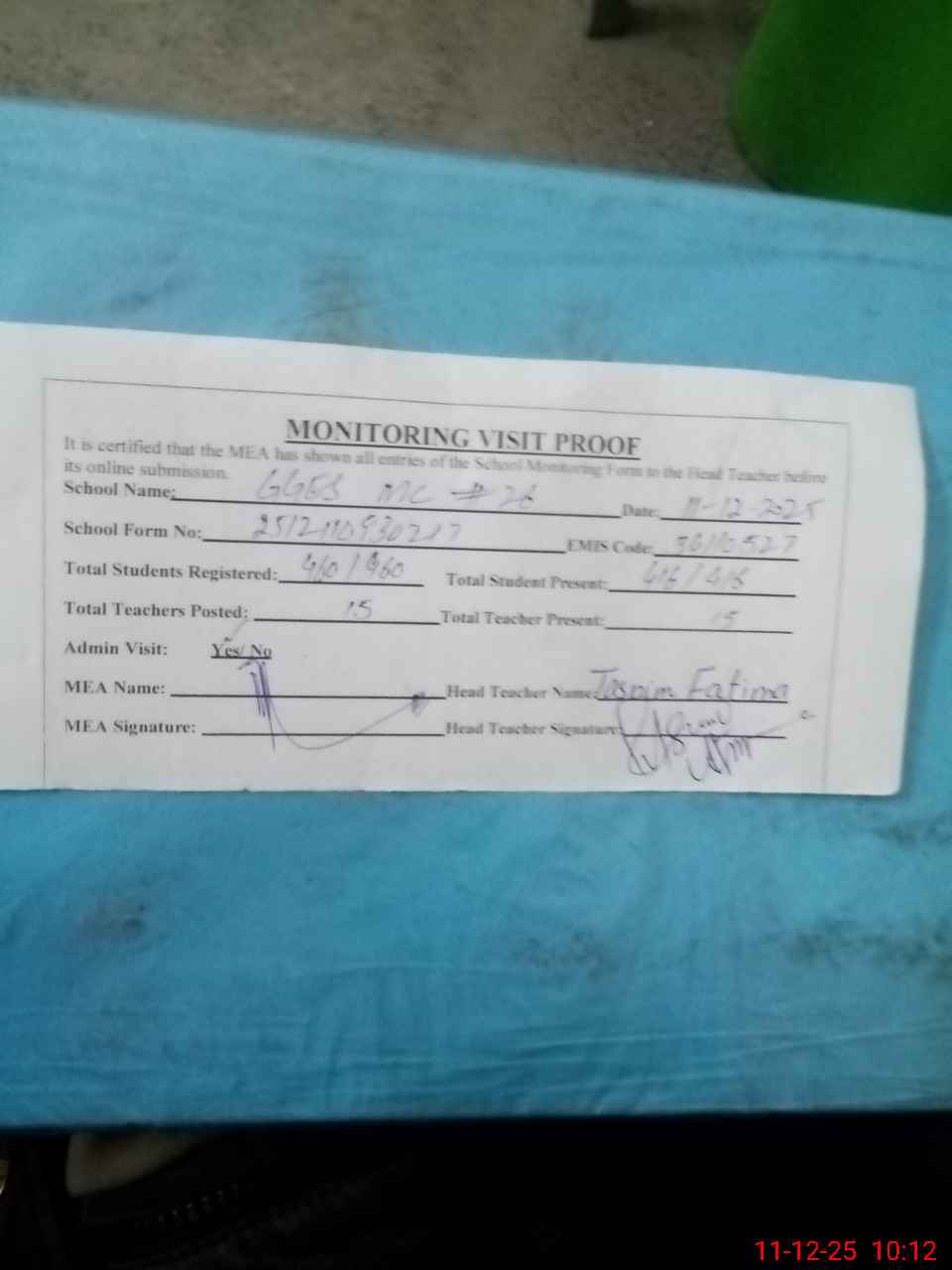 | Attendance Register | Head Teacher | MEA with School | Visit Proof |