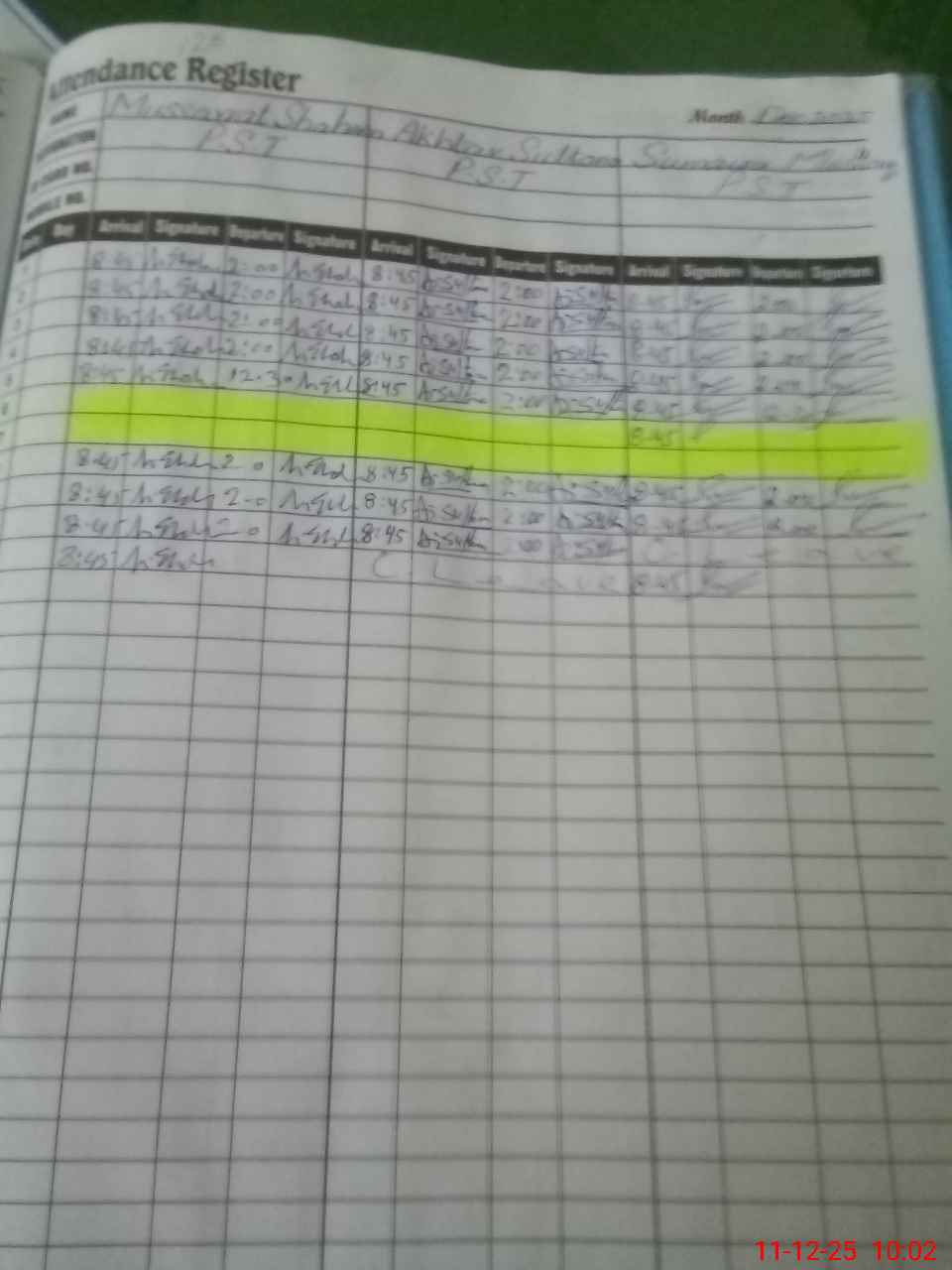 | CNIC | Full Name | Designation | R/C | Absence During Last Calender Month |