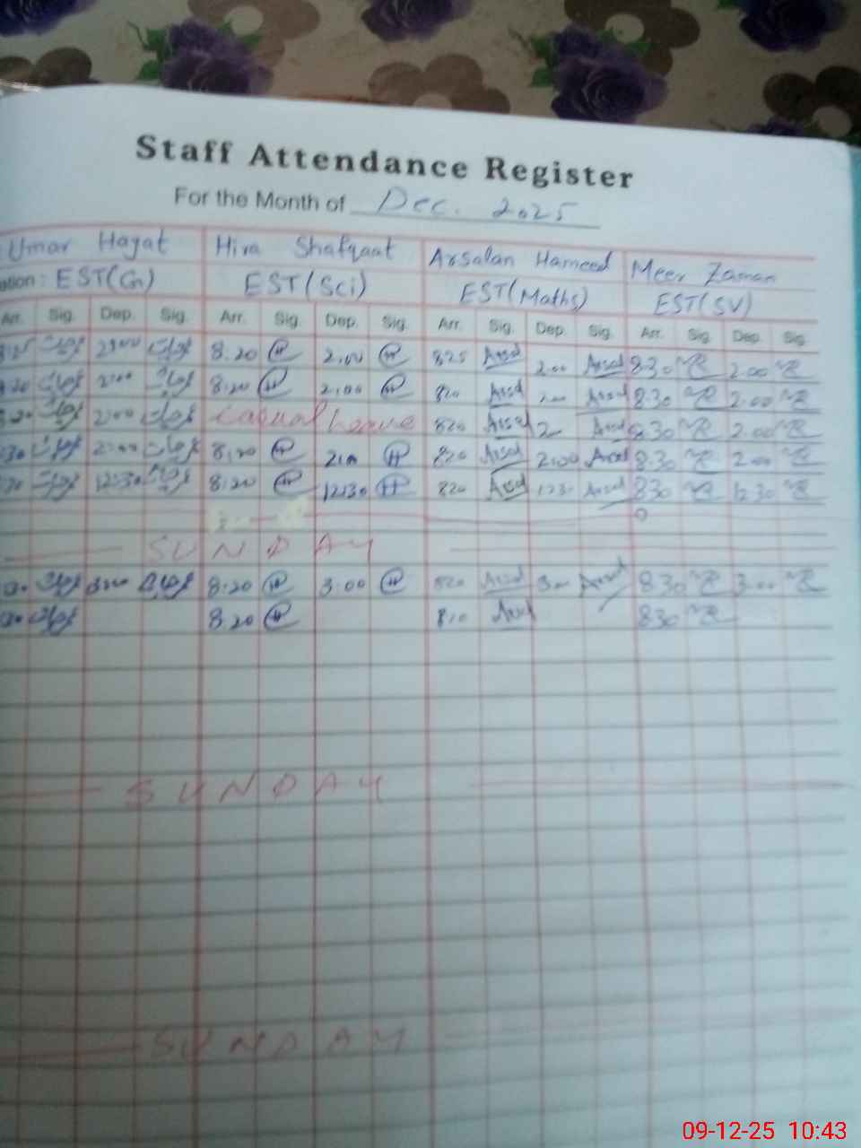 | CNIC | Full Name | Designation | R/C | Absence during last cal. month |