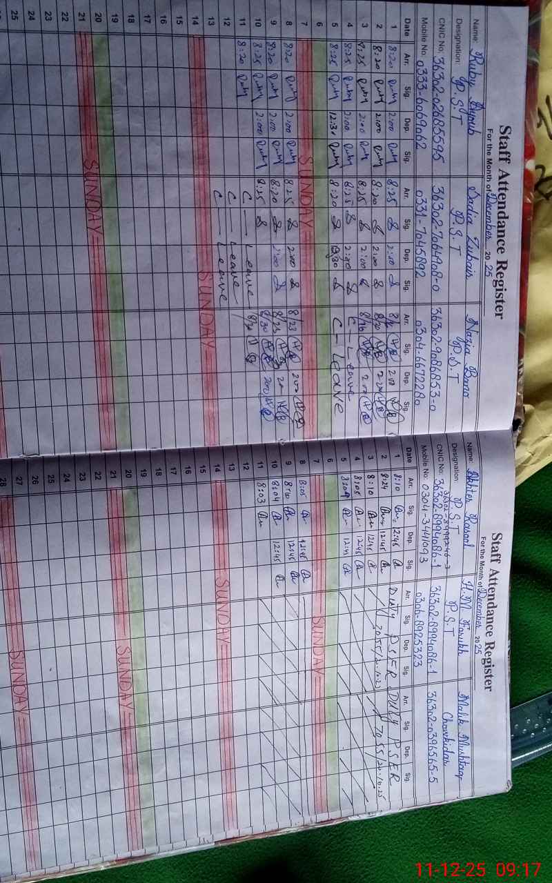 | CNIC | Full Name | Designation | R/C | Absence During Last Calender Month |