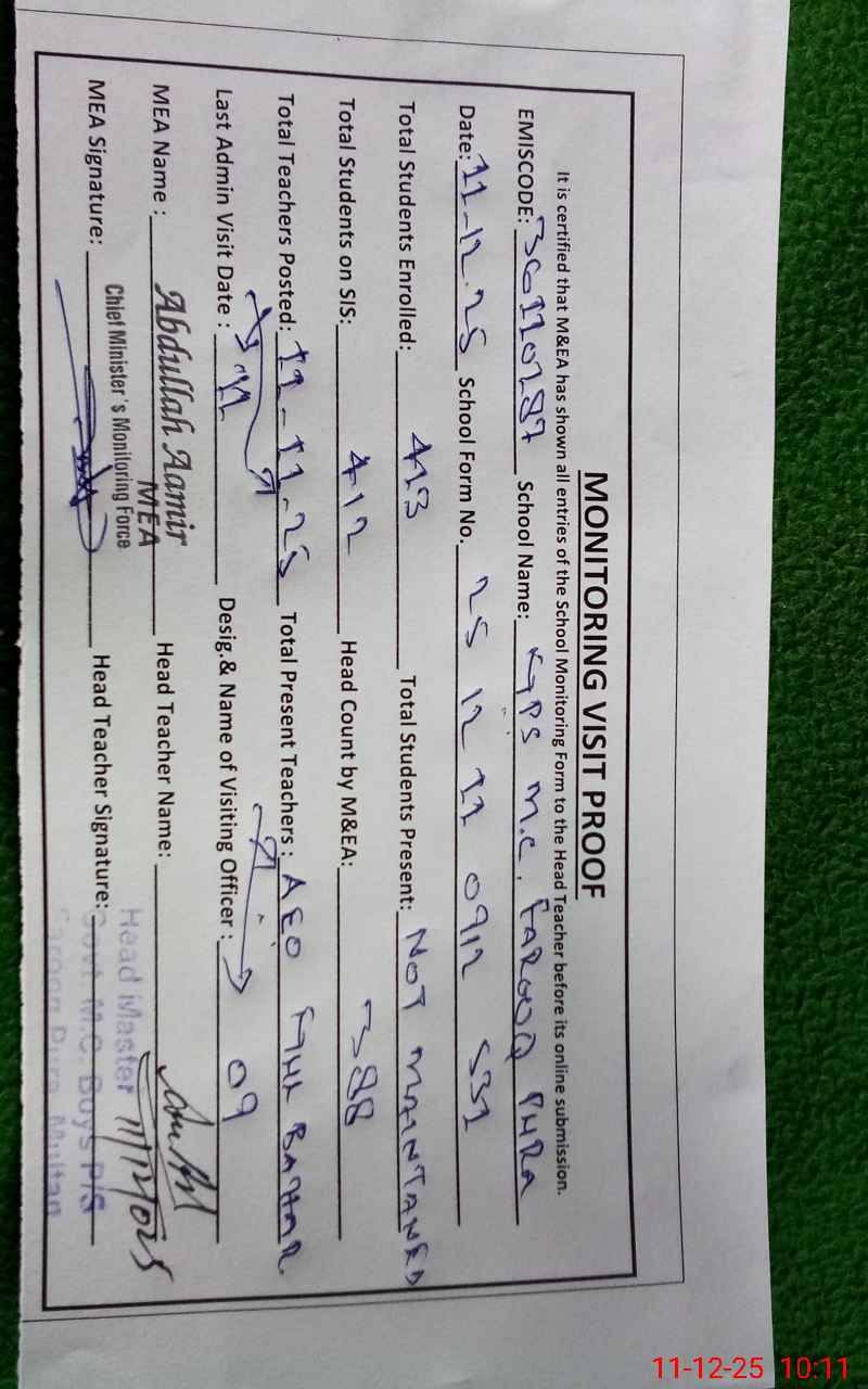 | EMIS Code: 36110187 | Name of School: GPS MC FAROOQ PURA MULTAN | |||