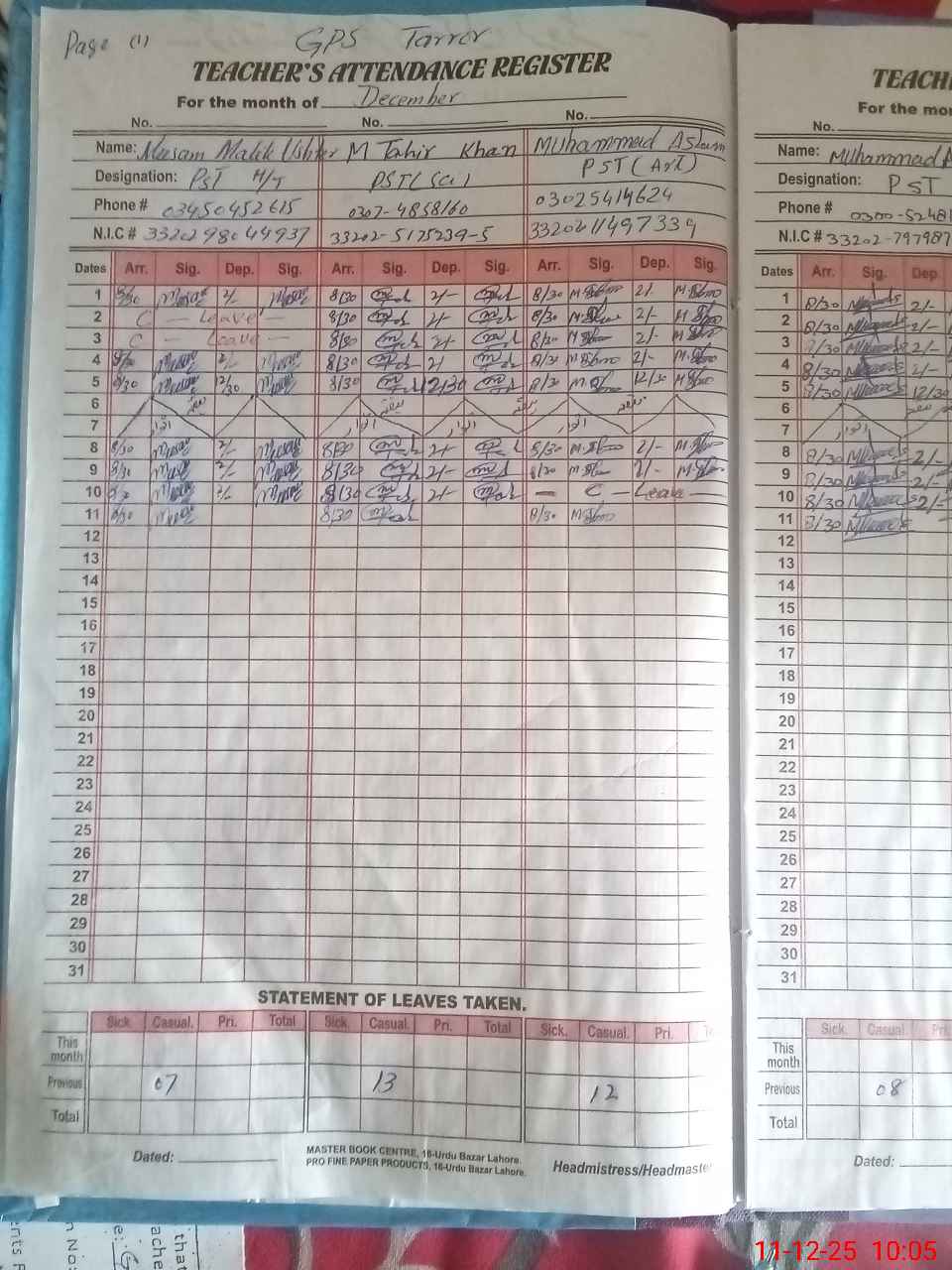 | CNIC | Full Name | Designation | R/C | Absence During Last Calender Month |