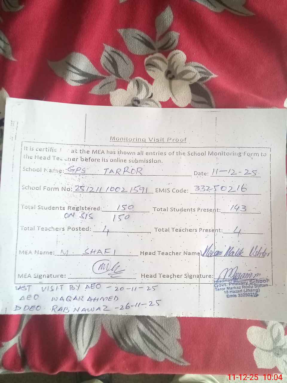 | Attendance Register | Head Teacher | MEA with School | Visit Proof |