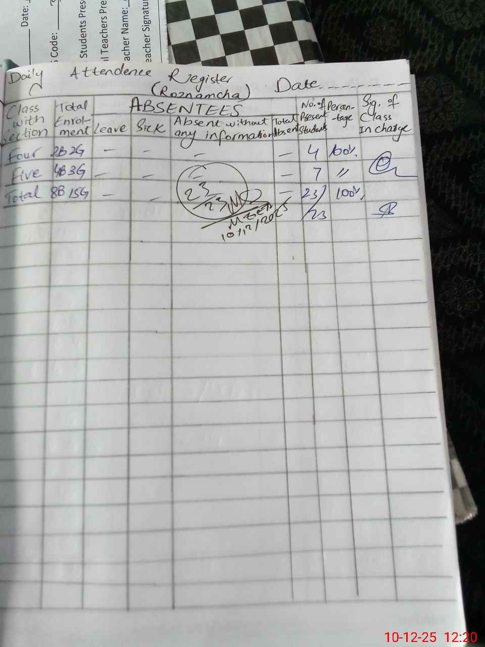 | Total Students Present | 0 | 0 | 5 | 2 | 1 | 4 | 7 | 23 | ||||||||
