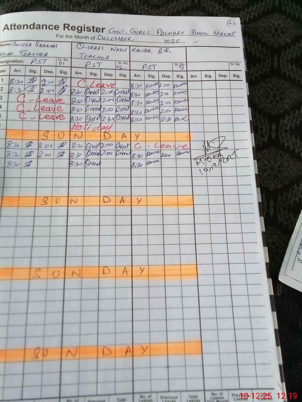 | CNIC | Full Name | Designation | R/C | Absence During Last Calender Month |