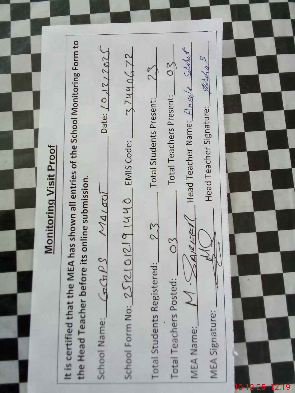 | Attendance Register | Head Teacher | MEA with School | Visit Proof |