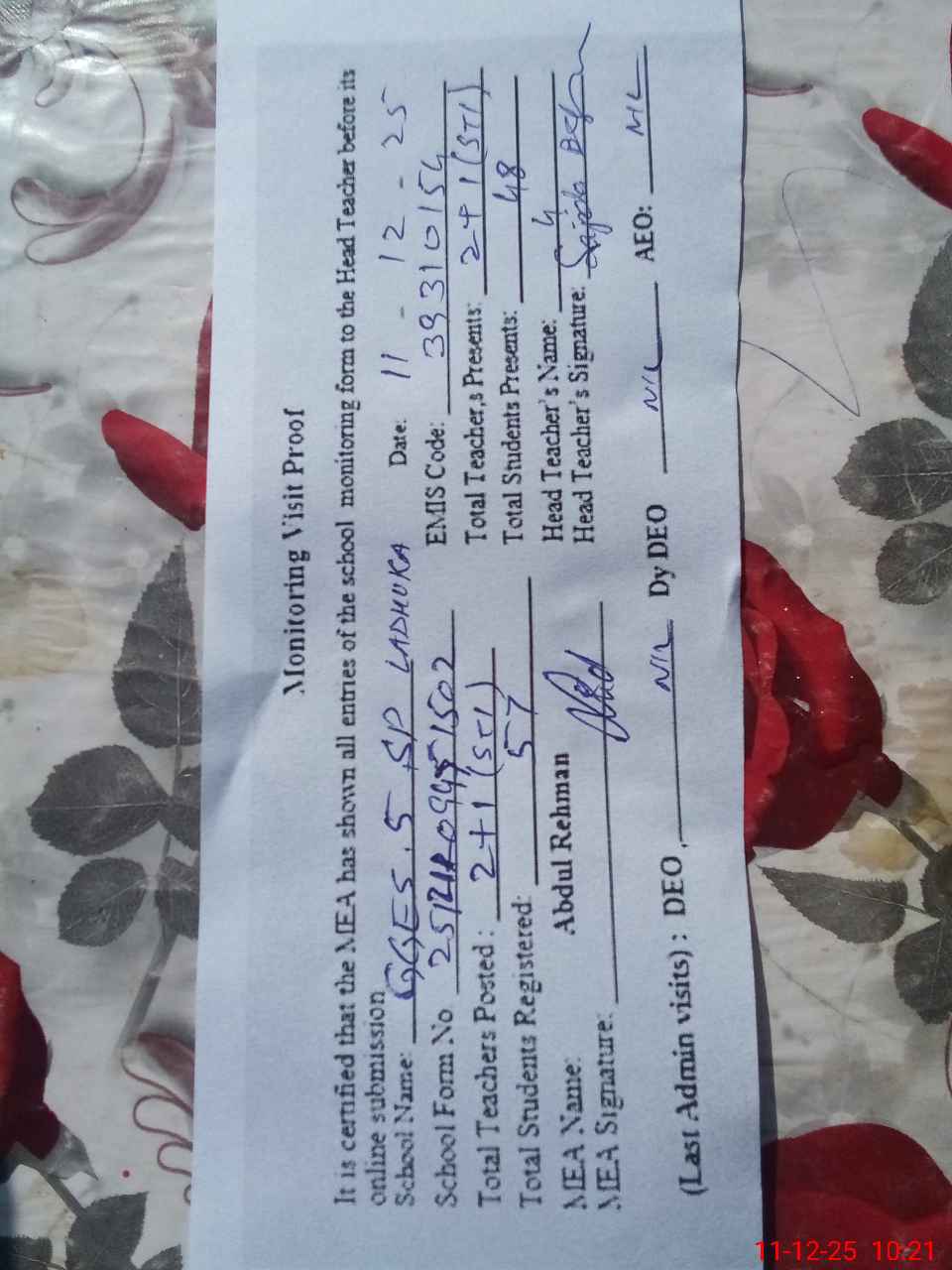 | Certified that this School was Inspected by the Undersigned MEA/DMO Today and the Information Stated Above is as Per Record. | |||||
