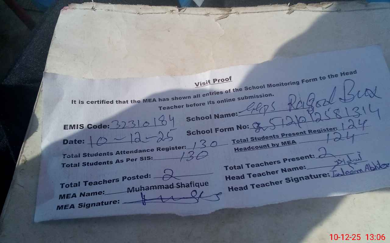 | Attendance Register | Head Teacher | MEA with School | Visit Proof |