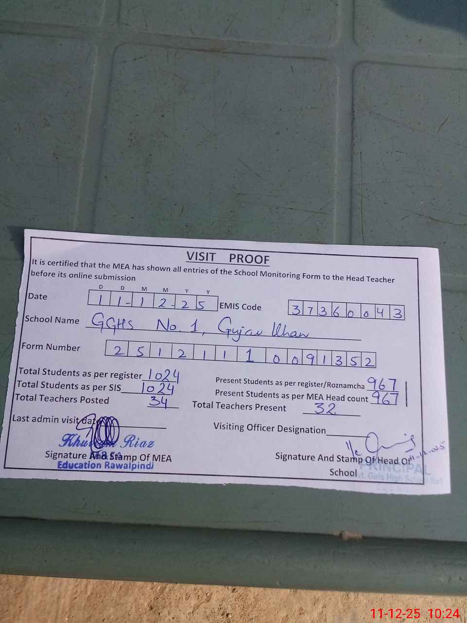 | EMIS Code: 37360043 | Name of School: GGHS NO. 1 GUJAR KHAN | |||