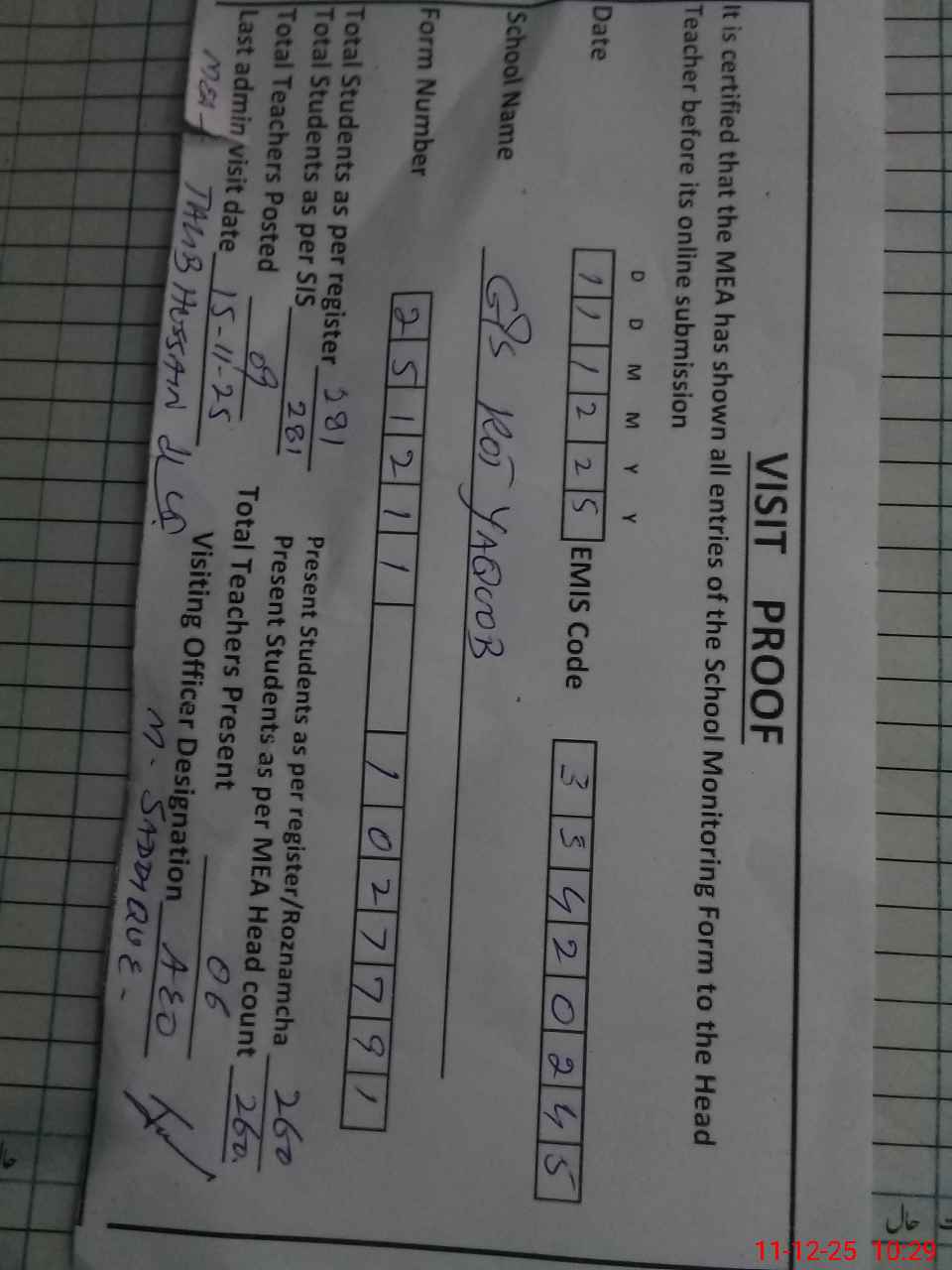 | Certified that this School was Inspected by the Undersigned MEA/DMO Today and the Information Stated Above is as Per Record. | |||||