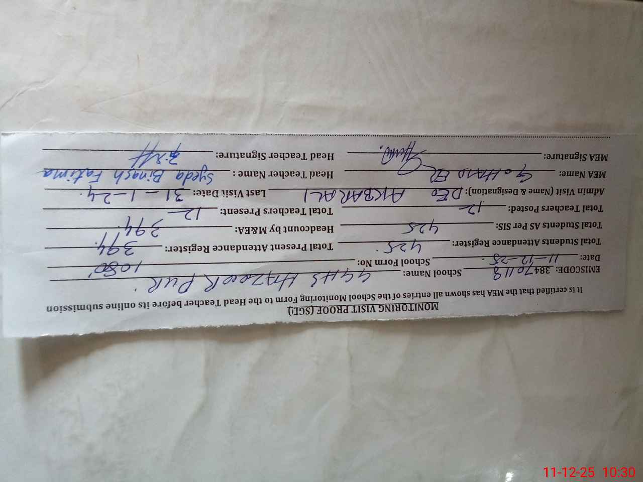 | Attendance Register | Head Teacher | MEA with School | Visit Proof |