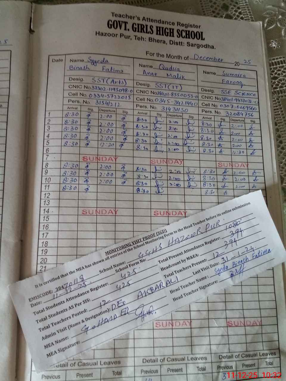 | CNIC | Full Name | Designation | R/C | Absence During Last Calender Month |