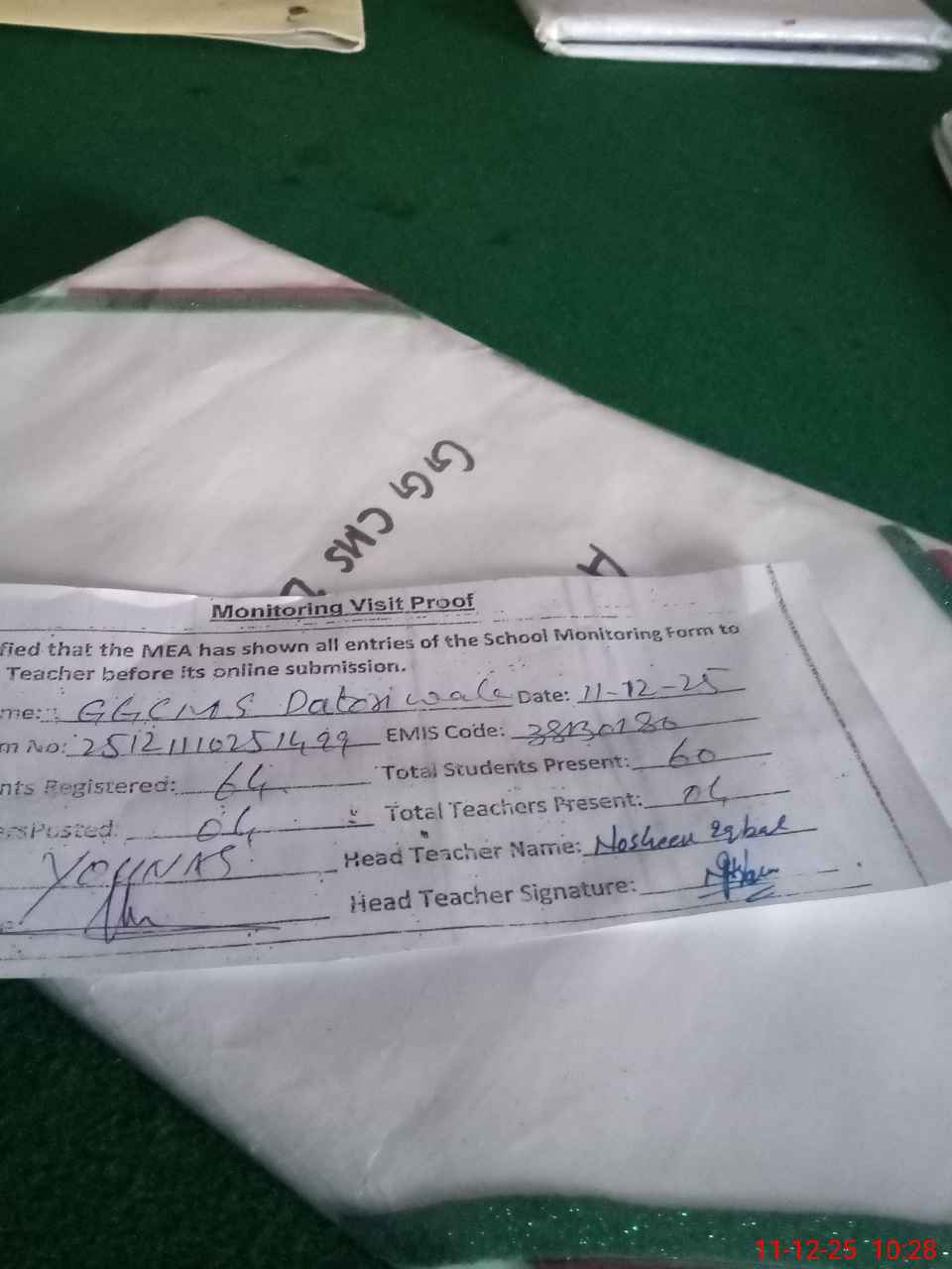 | EMIS Code: 38130180 | Name of School: GGCMS DATORAY WALA | |||