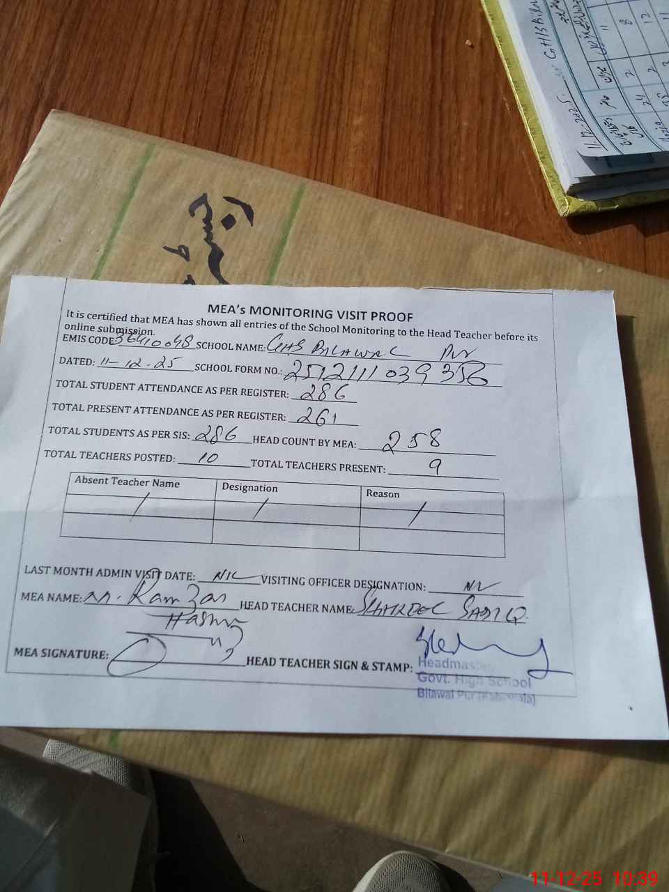 | Attendance Register | Head Teacher | MEA with School | Visit Proof |