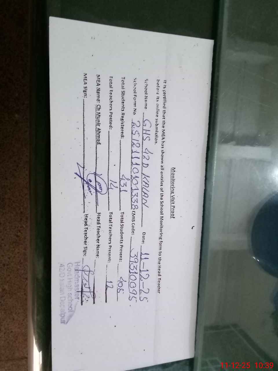 | Attendance Register | Head Teacher | MEA with School | Visit Proof |