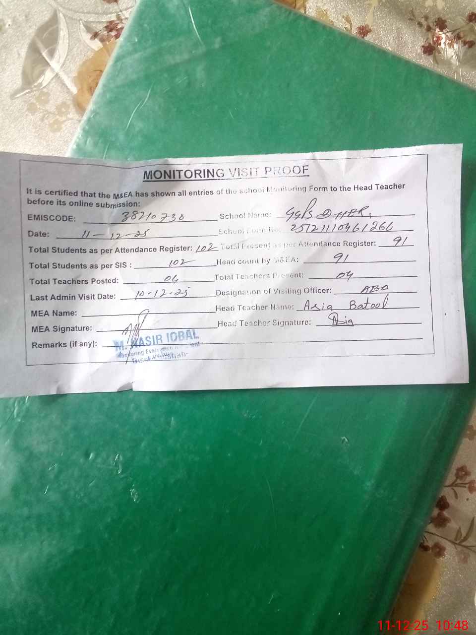 | EMIS Code: 38210730 | Name of School: GGPS DHERI PADHRAR | |||