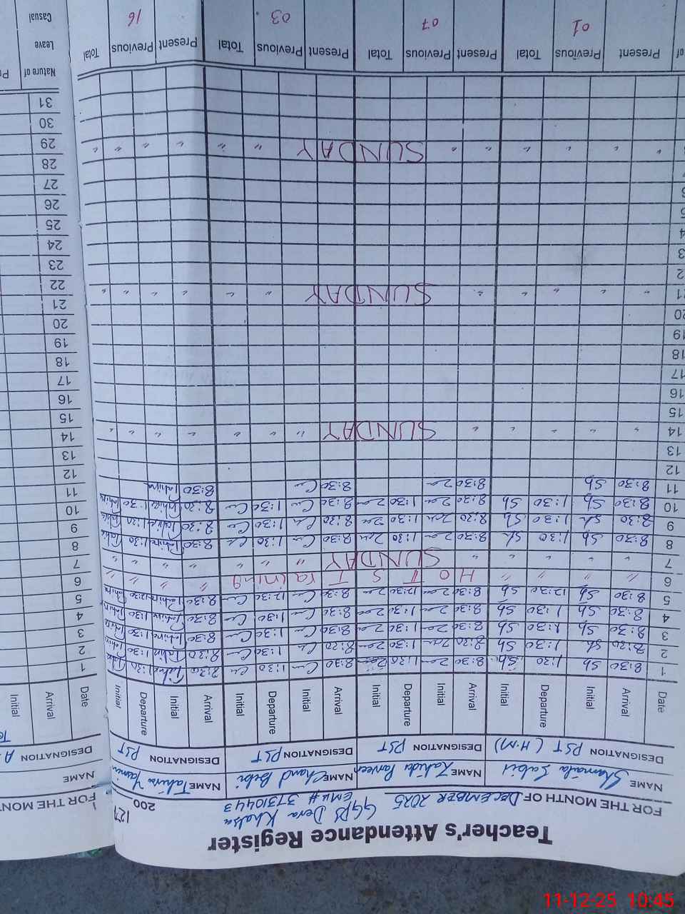 | CNIC | Full Name | Designation | R/C | Absence During Last Calender Month |