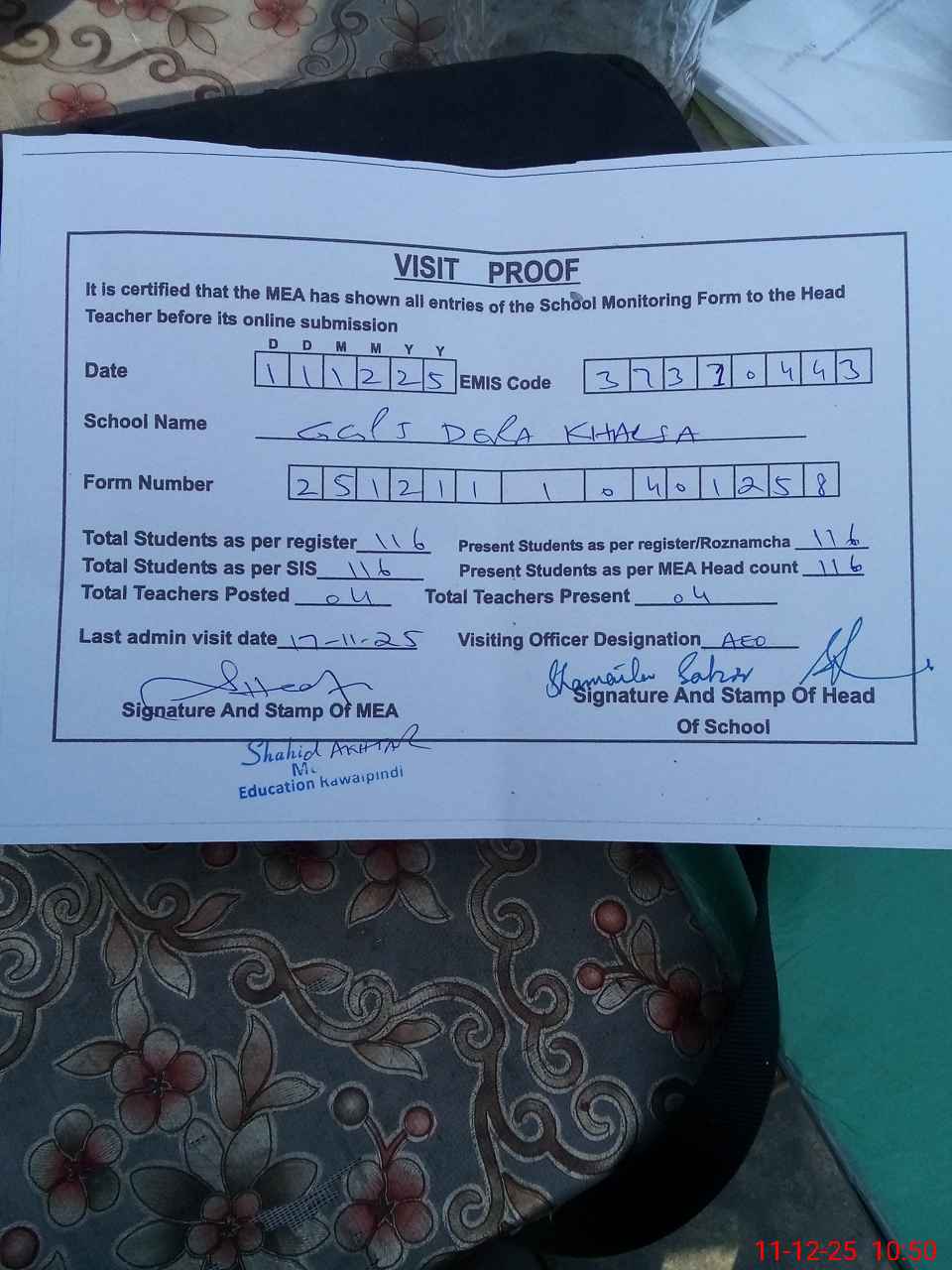 | Attendance Register | Head Teacher | MEA with School | Visit Proof |