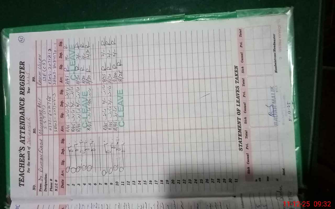 | Name: IJ**** AH**** CH**** Designation: (School Headmaster's/Headmistress's) H M Phone/Cell Number: 03**** |