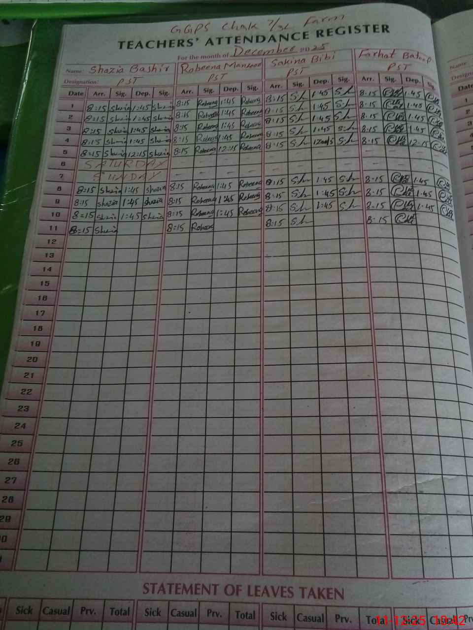| CNIC | Full Name | Designation | R/C | Absence During Last Calender Month |
