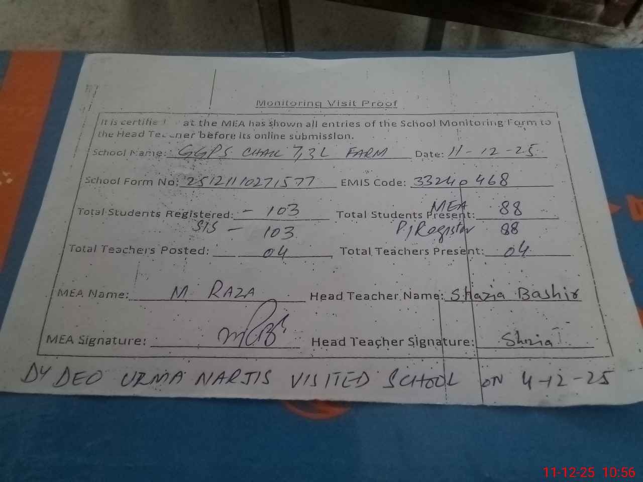 | Attendance Register | Head Teacher | MEA with School | Visit Proof |