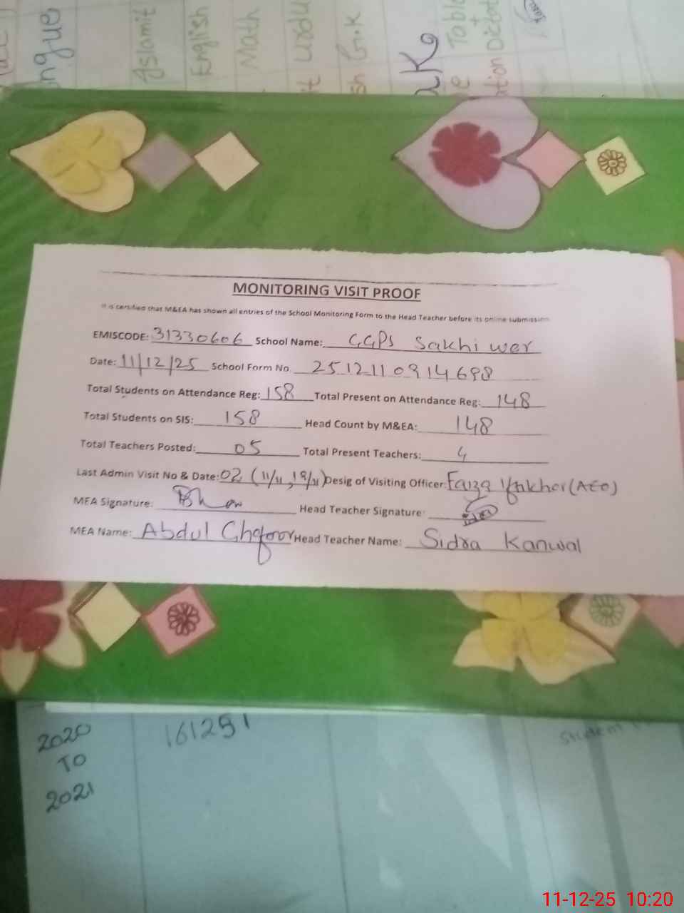 | Attendance Register | Head Teacher | MEA with School | Visit Proof |