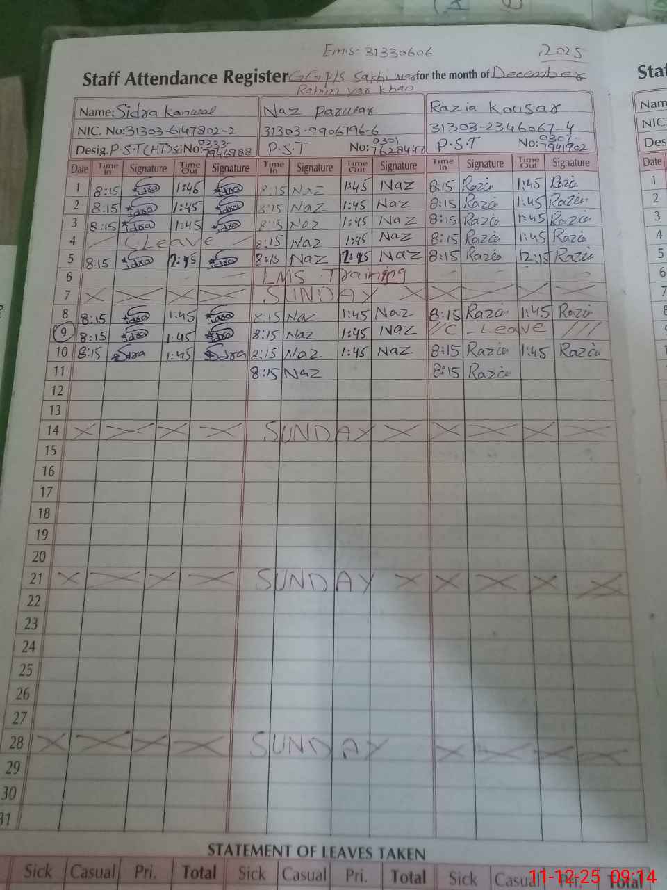 | CNIC | Full Name | Designation | R/C | Absence during last cal. month |