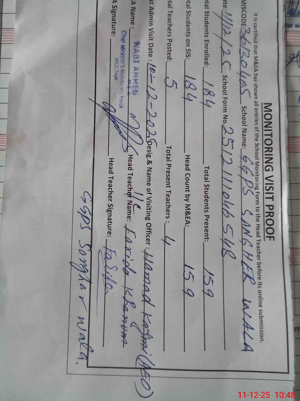 | Attendance Register | Head Teacher | MEA with School | Visit Proof |