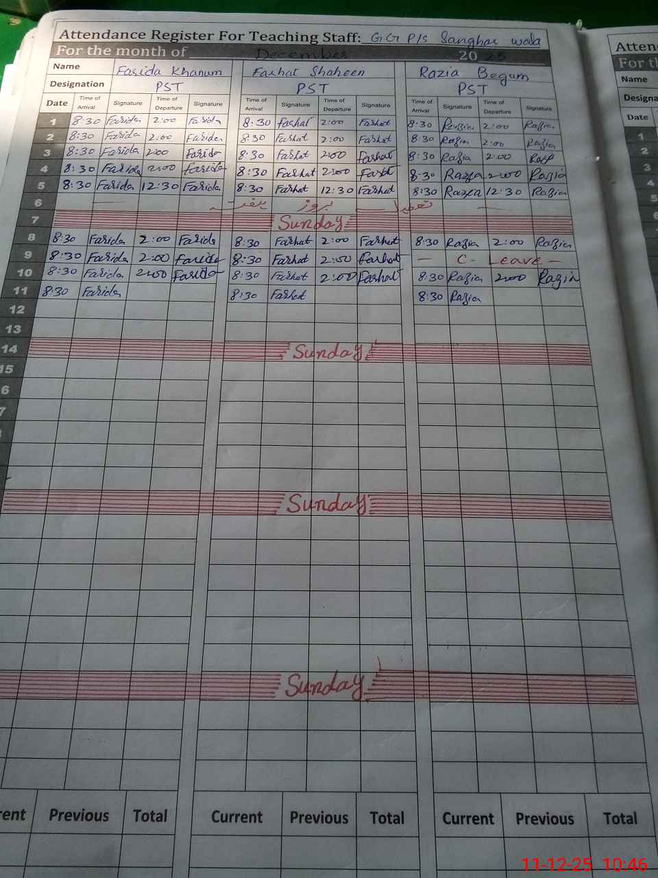 | CNIC | Full Name | Designation | R/C | Absence During Last Calender Month |