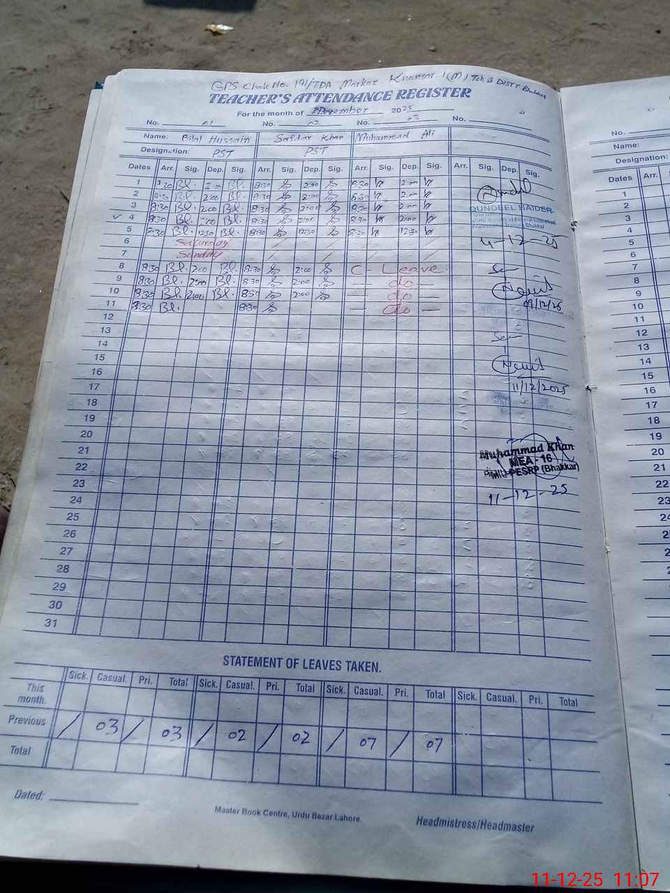 | CNIC | Full Name | Designation | R/C | Absence During Last Calender Month |