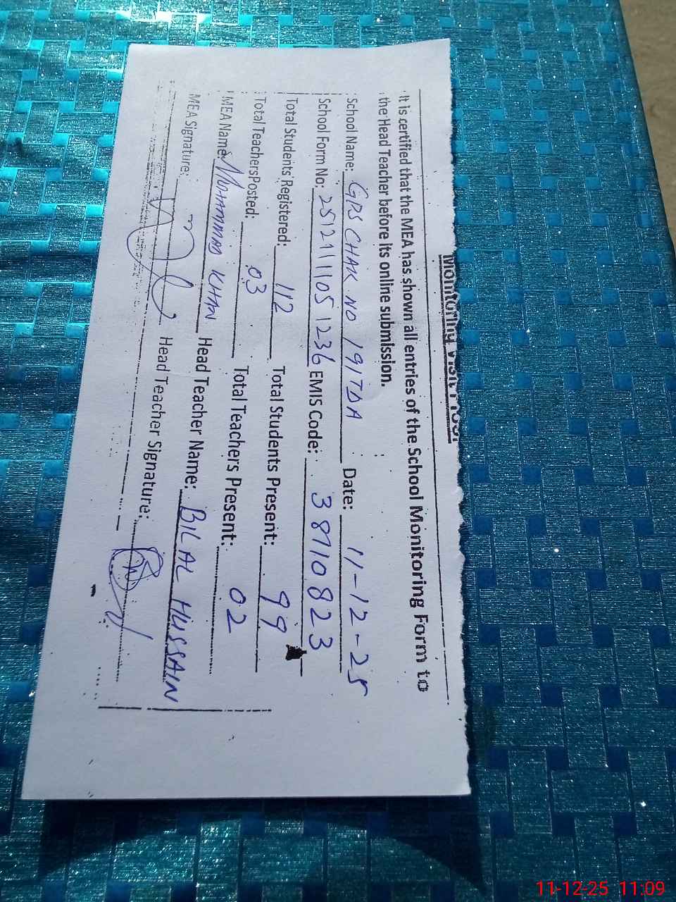 | Monitoring Date: 11-12-2025 | Start Time: 11-12-2025 10:41 AM | End Time: 11-12-2025 11:10 AM | Name of MEA: Mu**** Kh**** | |