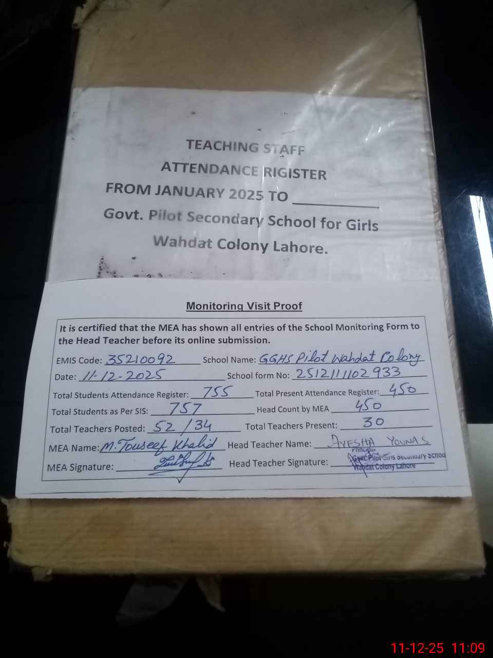 | Attendance Register | Head Teacher | MEA with School | Visit Proof |