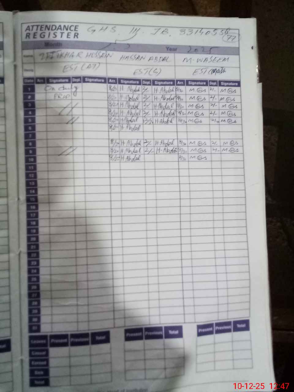 | CNIC | Full Name | Designation | R/C | Absence During Last Calender Month |