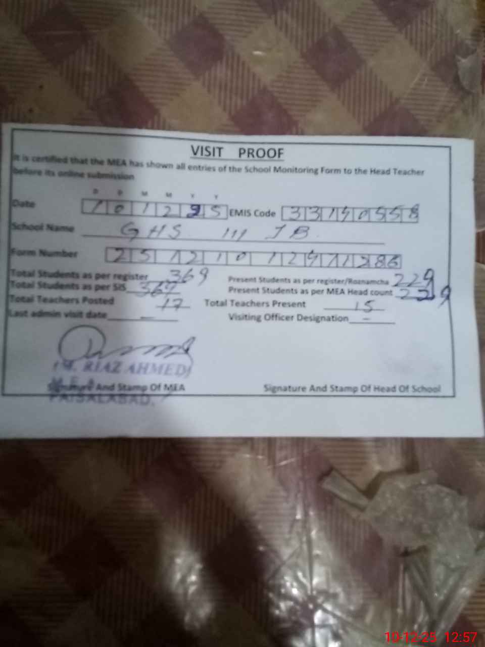 | Remarks (Use Separate Page if Required): Sir Headteacher not agree for sign due to low attendance of students | |||||
