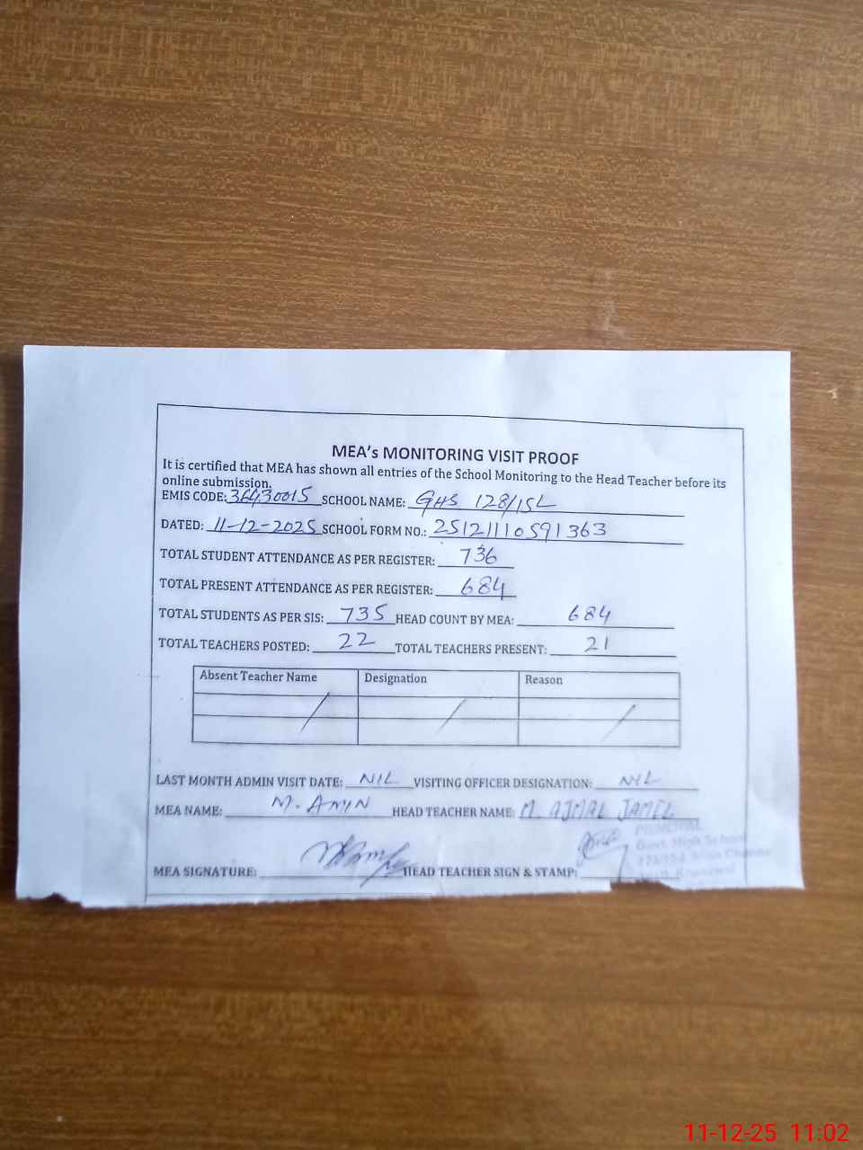 | EMIS Code: 36430015 | Name of School: GHS 128/15-L, MIAN CHANNU | |||