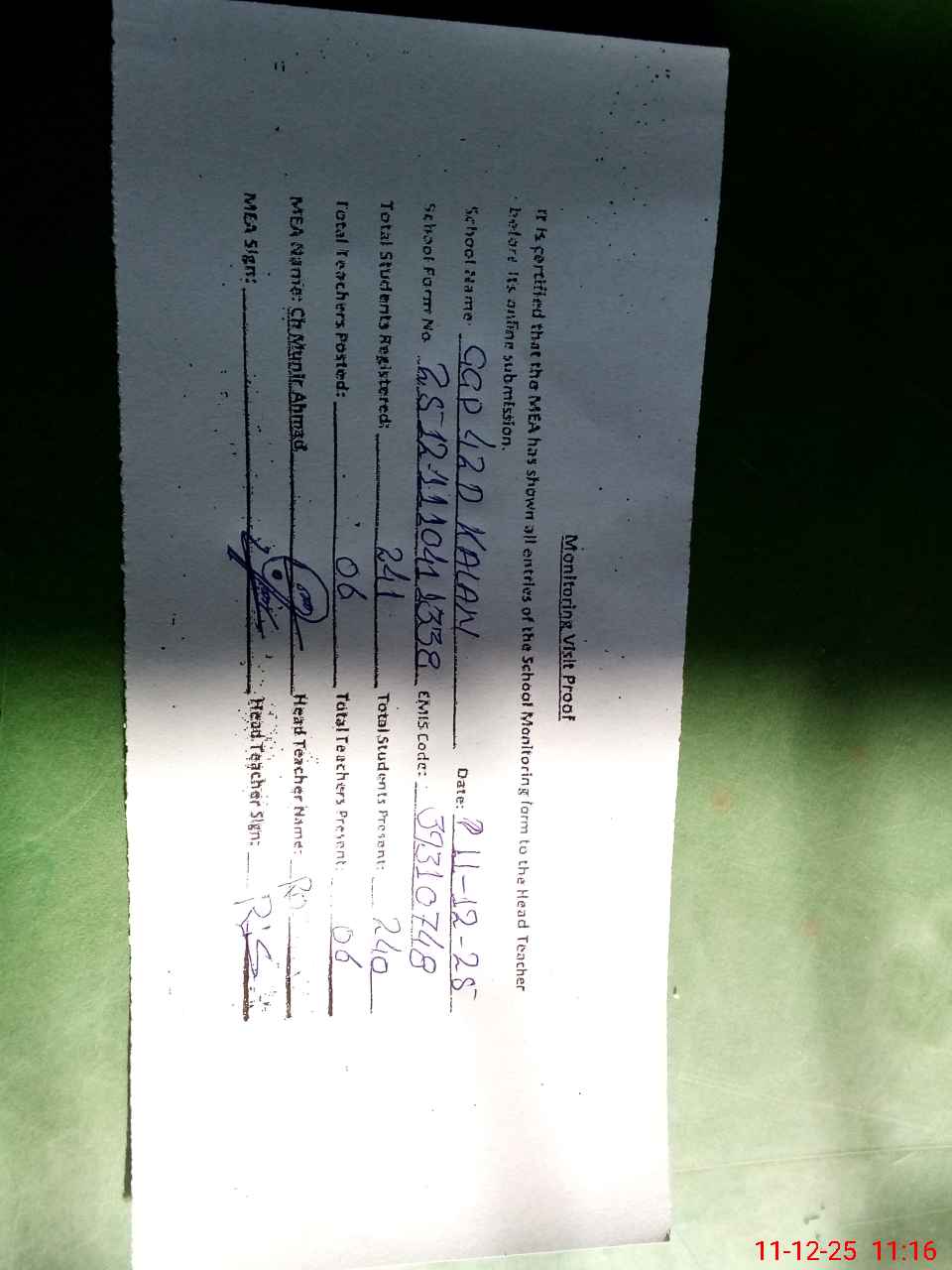 | Attendance Register | Head Teacher | MEA with School | Visit Proof |