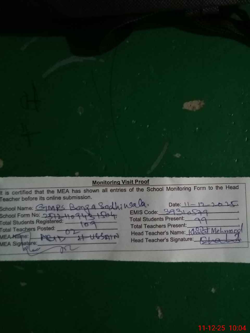 | Attendance Register | Head Teacher | MEA with School | Visit Proof |