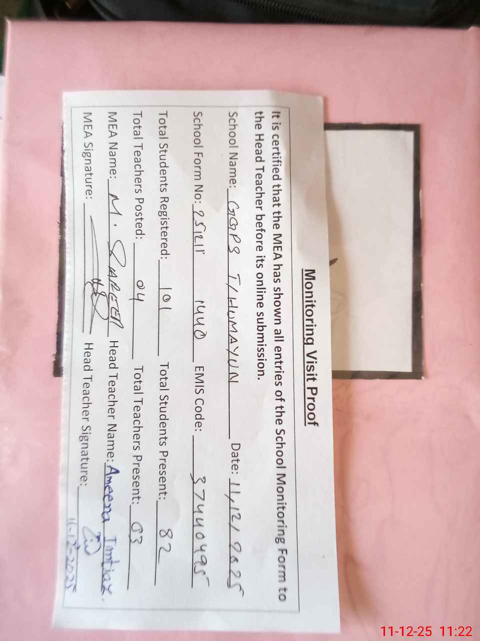 | Attendance Register | Head Teacher | MEA with School | Visit Proof |