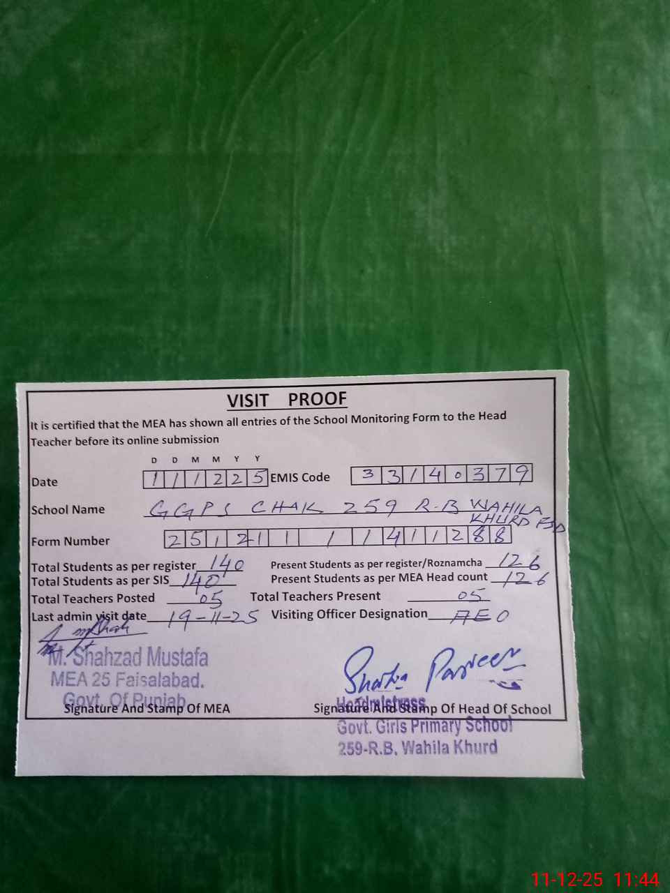 | Attendance Register | Head Teacher | MEA with School | Visit Proof |
