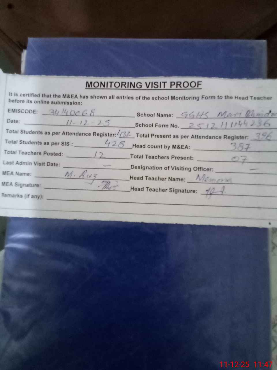 | Attendance Register | Head Teacher | MEA with School | Visit Proof |