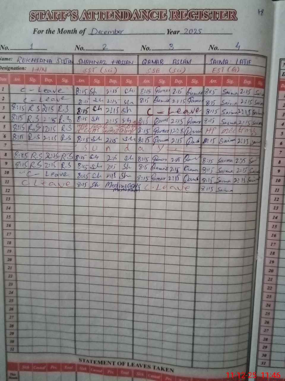 | CNIC | Full Name | Designation | R/C | Absence During Last Calender Month |