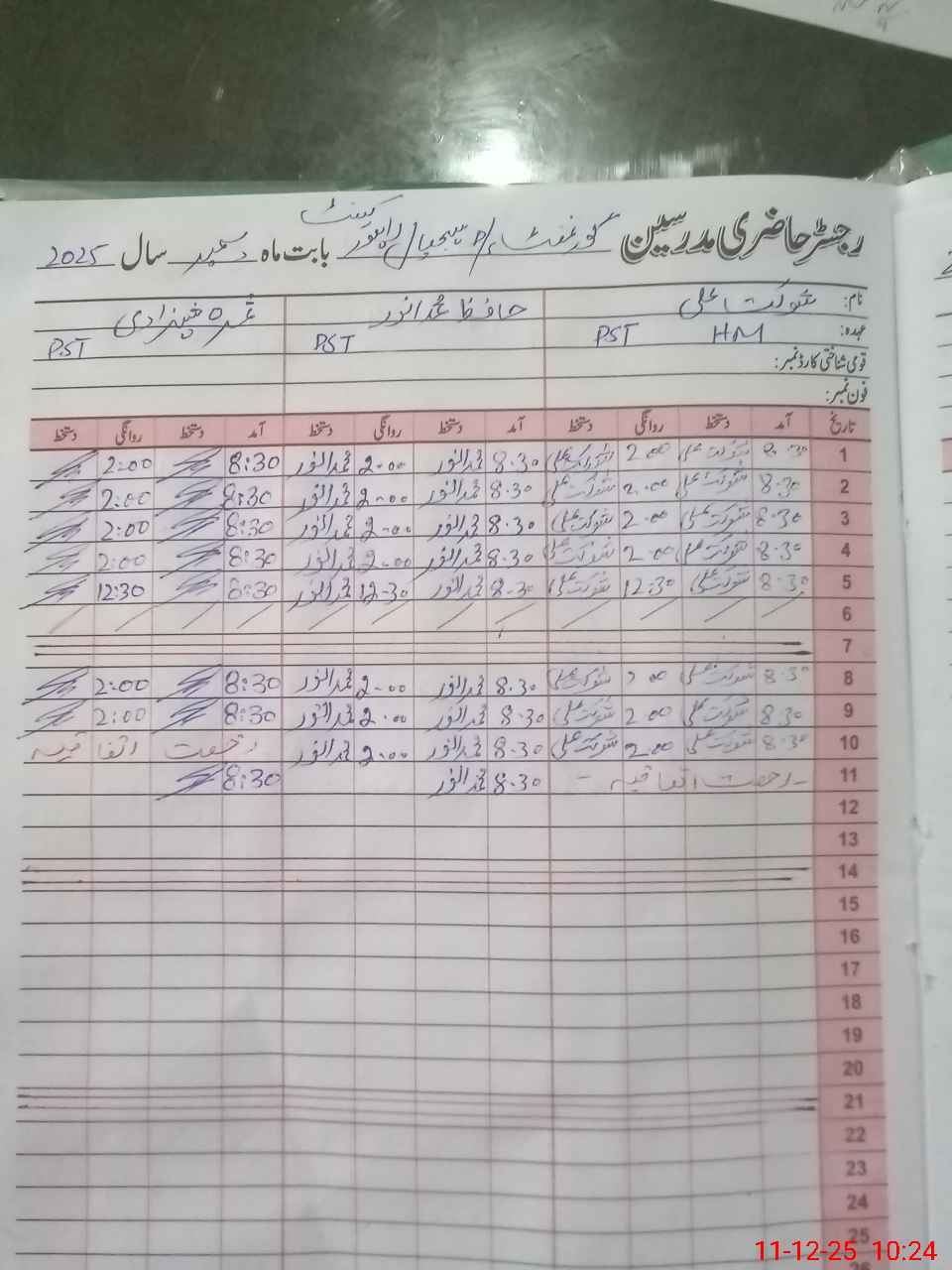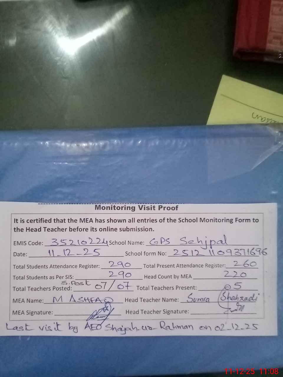 | Remarks (Use Separate Page if Required): Teachers Sanctioned Post 07 and Filled 07 Last visit by AEO Shujah ur Rahman on 02-12-25 Total present strength of students as per register 260 out of 290 but as head count present students strength is 220 here the difference is 40 students School has large ground no proper grass planted at here looking so muddy Paint work looking average condition for whole the school building Cleaning is not up to standard 35210224 | |||||