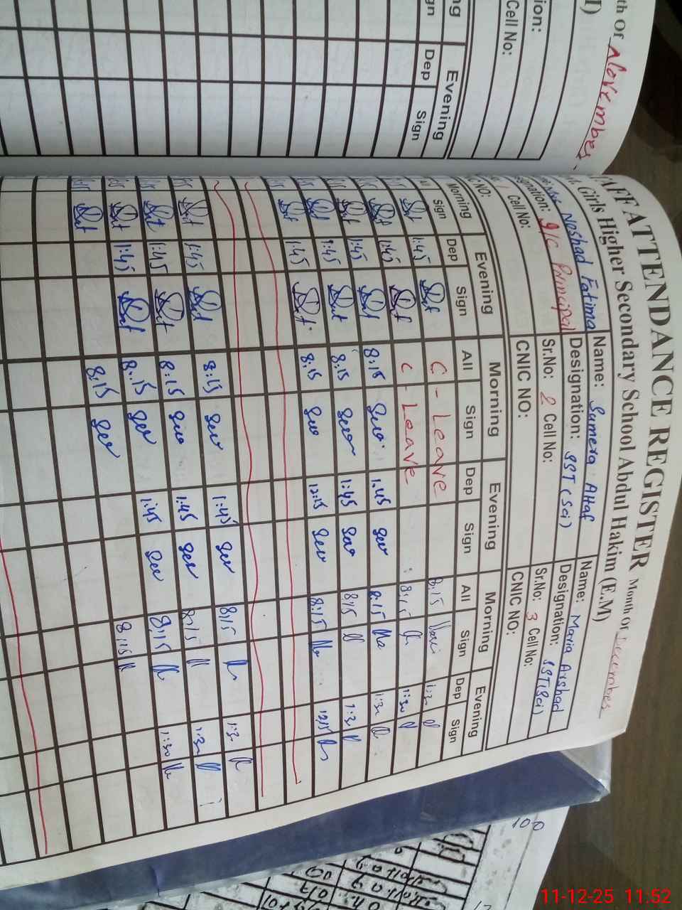 | CNIC | Full Name | Designation | R/C | Absence During Last Calender Month |