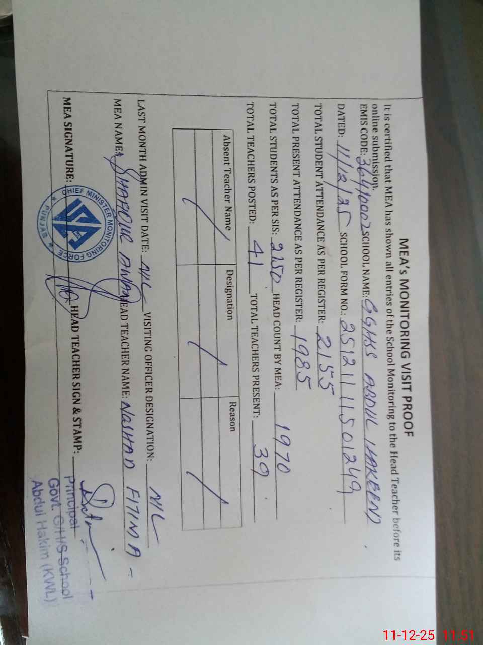| Attendance Register | Head Teacher | MEA with School | Visit Proof |