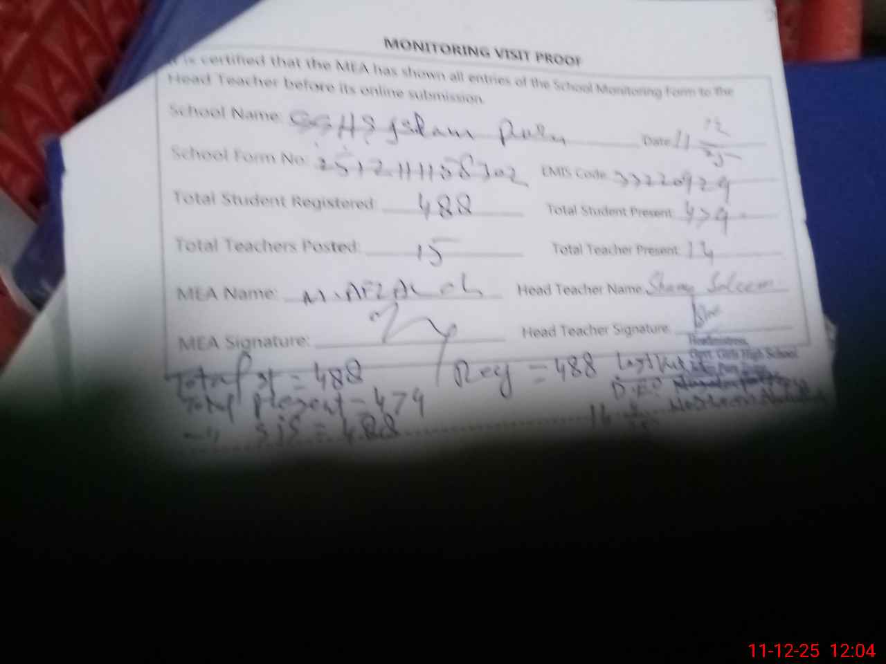 | Attendance Register | Head Teacher | MEA with School | Visit Proof |