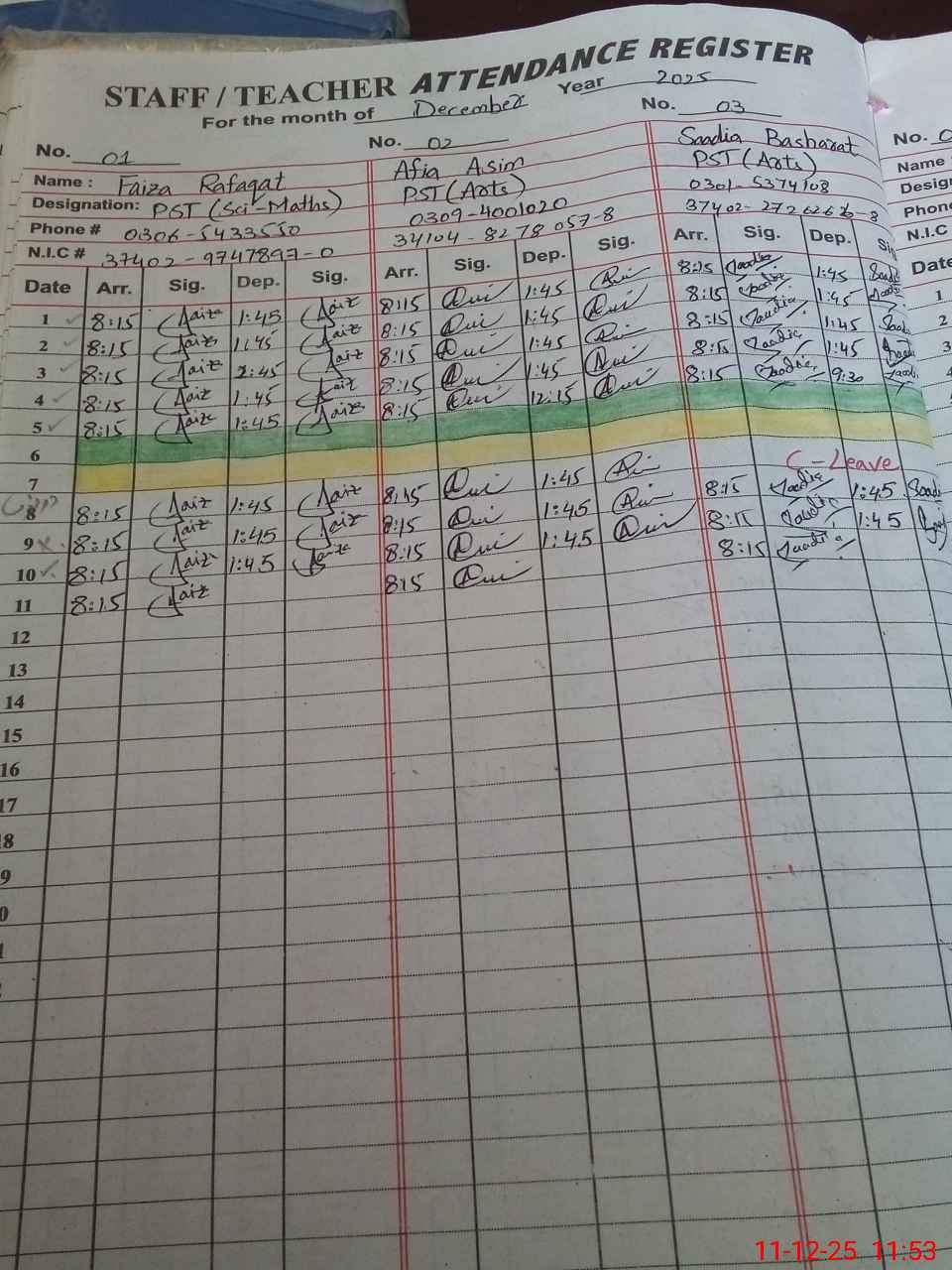 | CNIC | Full Name | Designation | R/C | Absence during last cal. month |