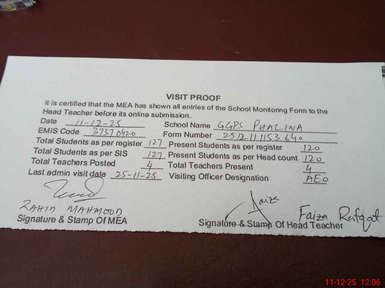 | Attendance Register | Head Teacher | MEA with School | Visit Proof |