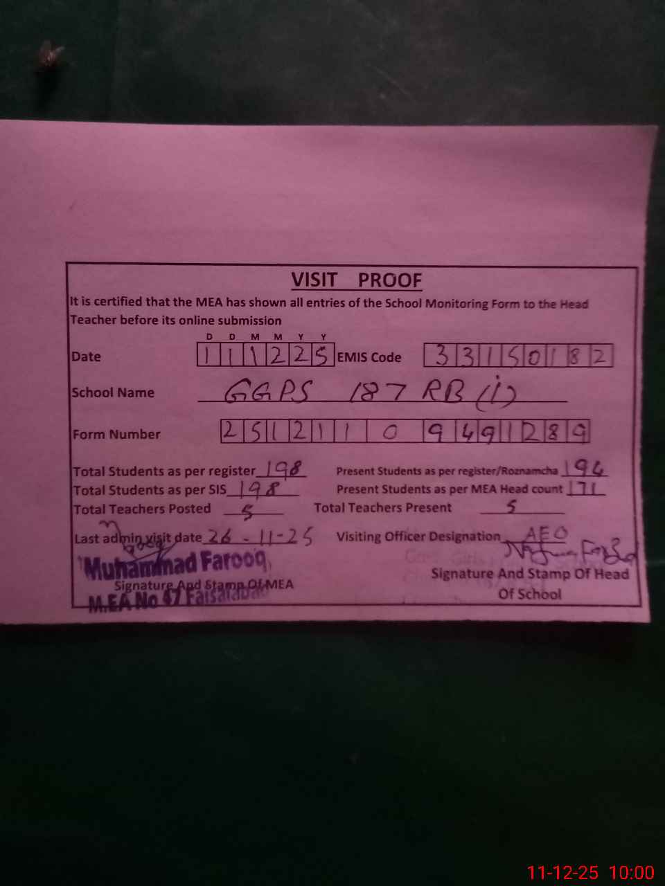 | Attendance Register | Head Teacher | MEA with School | Visit Proof |