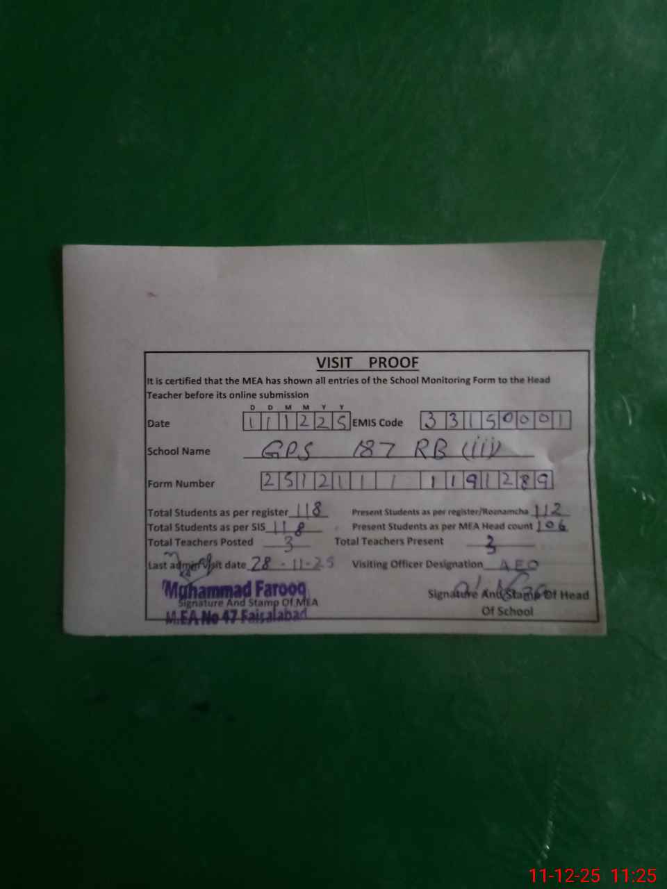 | Attendance Register | Head Teacher | MEA with School | Visit Proof |