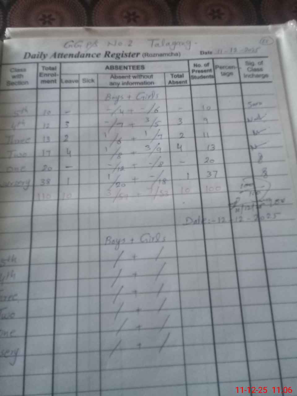 | Total Students Present | 0 | 0 | 20 | 13 | 11 | 9 | 10 | 100 | ||||||||